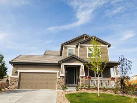 Charming two-story suburban home with white fence and manicured lawn at sunset.