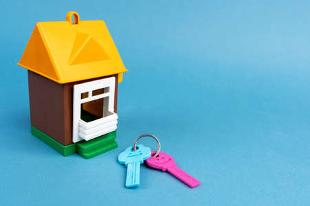 Key to the apartment with a tag with the inscription - home and the red decorative house are on a blue background. The topic of buying or purchasing an apartment.