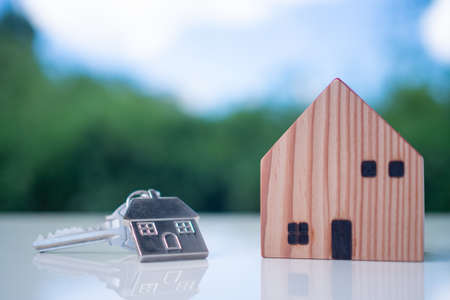 key and wooden Home model on table office. New House, Financial, Property insurance and real estate concepts
