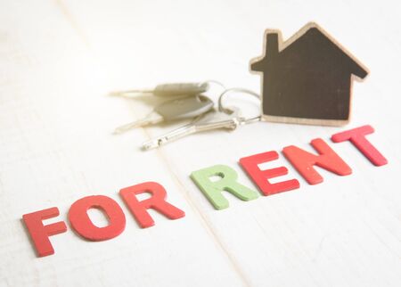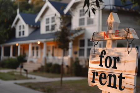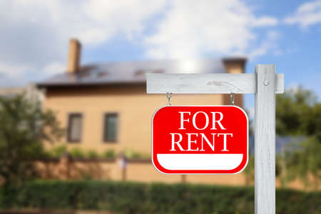 Sign with phrase FOR RENT and blurred view of beautiful house