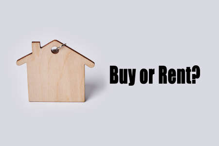 Wooden house model sticker with the inscription rent or mortgage on a white background