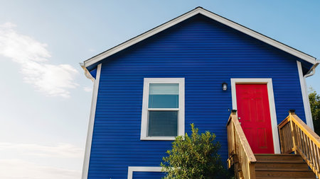Square frame Townhouses with brick wood and concrete wall against blue sky on a sunny day