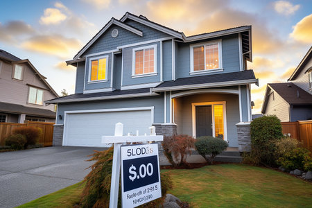 Sold Home For Sale Real Estate Sign In Front of House With Beautiful Sunset, For Sale Real Estate Sign in Front of New House. Real Estate Business Concept, AI Generated