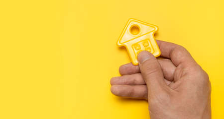 House symbol in male hands on yellow background flat lay top view. Model of plastic yellow house. Concept of buying home, apartment. Renting a house, real estate. Mortgage, real estate insurance.