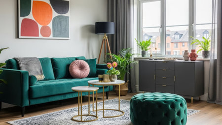 This image depicts a modern living room with a teal sofa adorned with decorative pillows. The room features a large window allowing natural light to flood in, a colorful abstract painting on the wall, and several indoor plants placed on a side table and on the floor. The space is completed with a tufted ottoman and a patterned rug. The image is on a transparent background, making it suitable for various design applications.