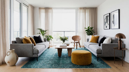 Modern living room interior with gray sofas, teal rug, and yellow pillows and puff. Spacious apartment with big windows, natural light, wooden coffee table, and stylish home decor accessories.