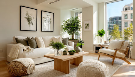 Bright and airy living room with a white sofa, wooden coffee table, and lush indoor plants, enhancing the cozy ambiance and inviting relaxation in a stylish space
