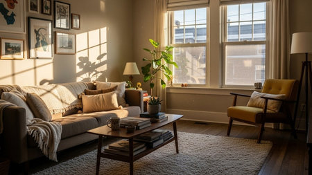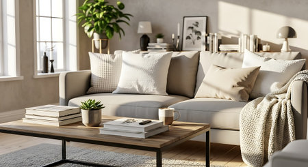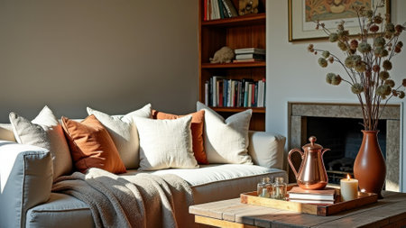 A warm, inviting living room with a coffee table featuring a mug, glasses, books, and a plant. A comfortable sofa with pillows and a cozy blanket is visible.