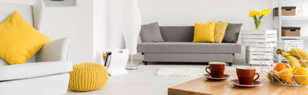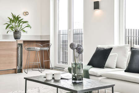 Sofa in a modern interior. On the table are a bouquet of tulips, coffee cups and a sweet bun. Black and white interior and sunny mood.