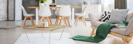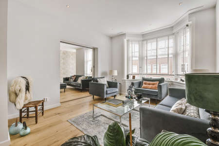 Living room interior with sofa, coffee table, armchair, lamp and other items