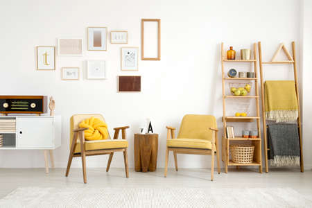 Wooden stool between yellow armchairs near white cupboard in living room interior with posters