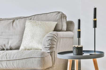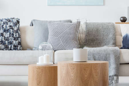 Candle and plant in grey concrete pot on wooden coffee tables in front of scandinavian designed sofa