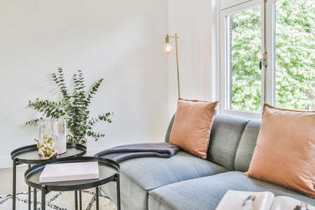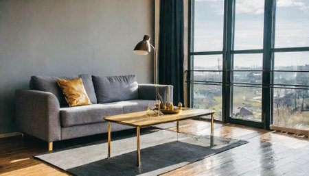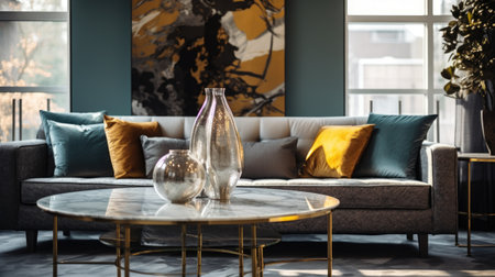Modern living room interior design with sofa, coffee table and decorative pillows