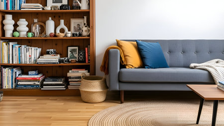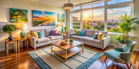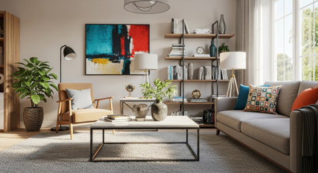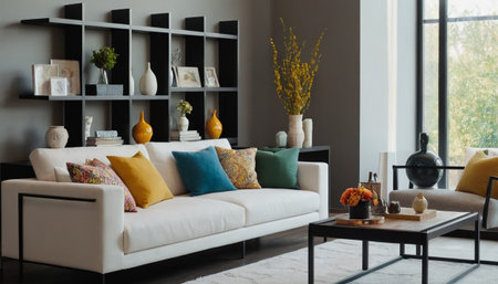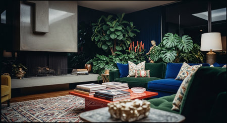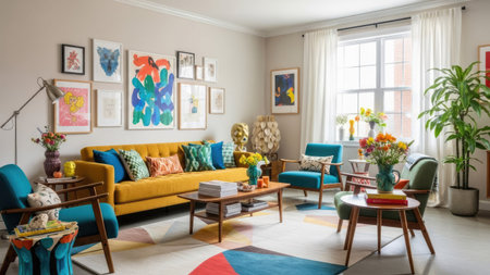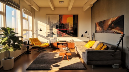 A stylish modern living room interior design with vivid and warm tone colors in the apartment. Generative AI AIG27.