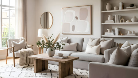 A cozy and stylish living room featuring a neutral color palette, plush furniture, and abundant natural light streaming through large windows.