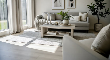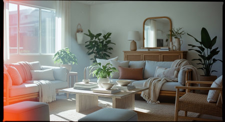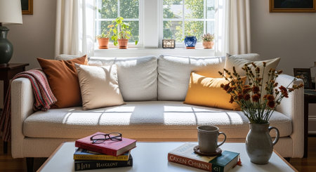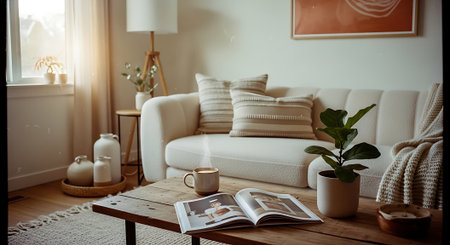 A serene living room with a white couch, wooden coffee table, and natural textures, featuring a plant, book, and coffee cup, with warm sunlight streaming through the window.