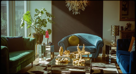 A cozy and opulent princess-style living room with charming decor, a marble-topped coffee table, and golden accessories.