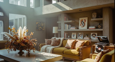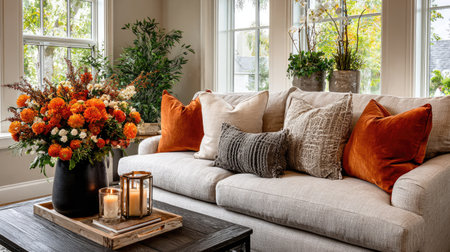 This inviting living room showcases a cozy sofa adorned with plush cushions and a vibrant autumn flower arrangement, creating a warm, welcoming atmosphere.