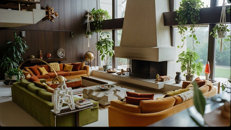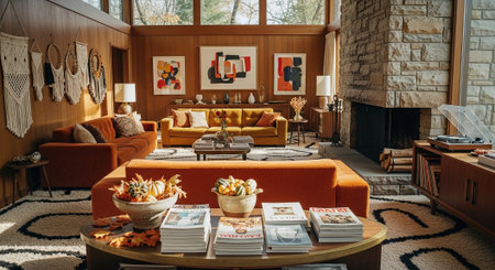 A cozy living room with mid-century modern decor, featuring orange sofas, a stone fireplace, and colorful abstract art on the walls