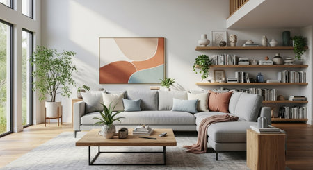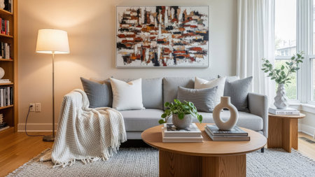 A serene living room scene featuring a gray sofa with throw pillows, a wooden coffee table with a plant, books, and a steaming cup of coffee, accompanied by a floor lamp and abstract art.