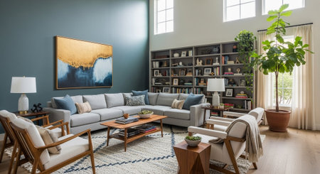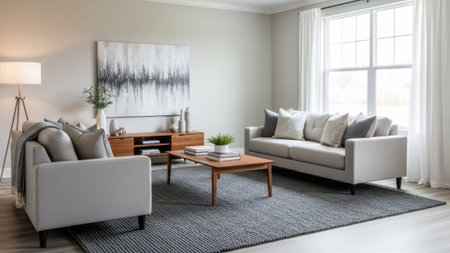A spacious living room displays comfortable furniture, including a sofa and armchair. The composition features a neutral color palette with wood accents and an artwork. Abundant natural light filters through the windows, illuminating the room. Suitable for home decor projects, lifestyle publications, or use as a background.