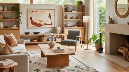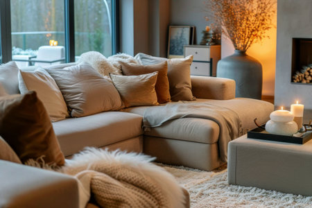 This image showcases a modern living room featuring a sofa, armchairs, and a coffee table. The scene includes large windows, neutral color palettes, and various decorative elements. The composition, lighting, and textures suggest a comfortable indoor setting ideal for residential design or editorial content.