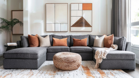 A cozy family room with muted taupe walls a plush ivory rug and a deep grey sectional adorned with muted orange and brown throw pillows and geometric wall art