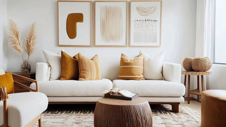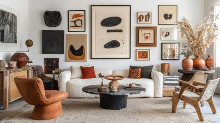 Explore a stylish living room that perfectly blends artistic elements and chic decor. This cozy space features earthy colors, comfortable furniture, and unique wall art.