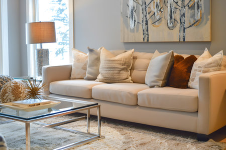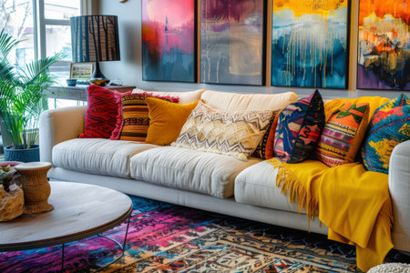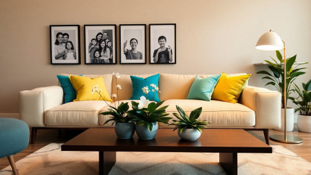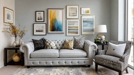 This inviting living room features a cozy sofa adorned with elegant pillows and modern art on the walls, creating a stylish yet relaxing atmosphere for everyday life.