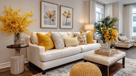 A beautifully styled living room featuring a comfortable white sofa adorned with yellow and patterned pillows. Bright floral artwork complements a cozy atmosphere, while elegant decor touches enhance the inviting space. Perfect for modern interior inspiration.