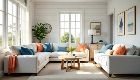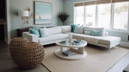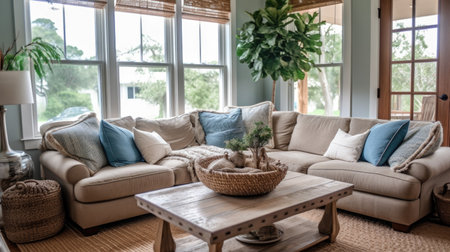 Living room decor, home interior design . Coastal Farmhouse style with Large windows decorated with Wood and Wicker material . Generative AI AIG26.