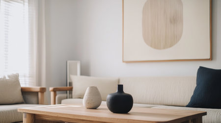 Close-up of minimalist decor elements in a living room, including a low coffee table, simple artwork, and subtle color accents