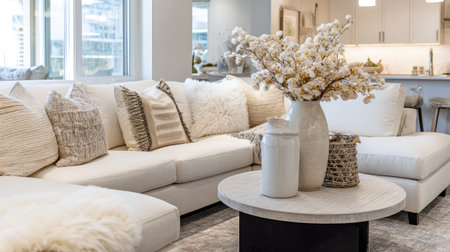 This image showcases a modern living room featuring a sofa, armchair, and coffee table. The neutral color palette includes beige, white, and brown tones, with natural lighting enhancing the space. The composition suggests a comfortable and inviting atmosphere, potentially suitable for interior design, home decor, or lifestyle related content.