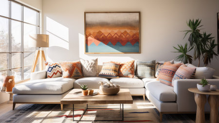Cozy modern living room with white sofa and earthy tones. That the image is generated using AI.