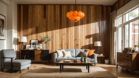mockup of a display day living room inner parts arrange with two orange rockers, a ad spot, wood divider surrounding, a sideboard, pendant lights, coffee tables. Creative resource, AI Generated