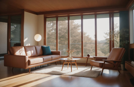 Living room decor, home interior design . Scandinavian Minimalist style with Large Window decorated with Light Wood and White material . Generative AI AIG26.