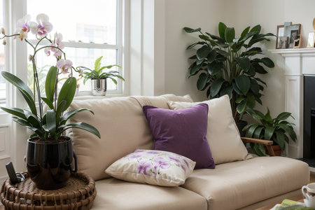 Interior of living room. Purple orchid in blossom blooming on coffee table by watering can. Home decorated with flowers and plants