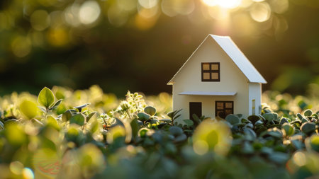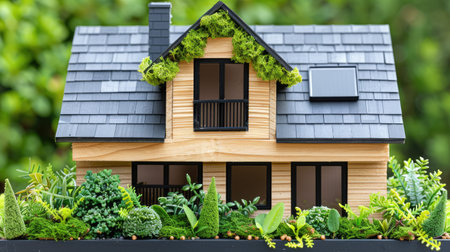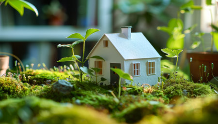 Sustainable living eco friendly paper house nestled among mossy greenery in a lush garden