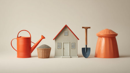 Still life scene features home insurance representation alongside tools for preventing water damage. Neutral background allows for text addition.