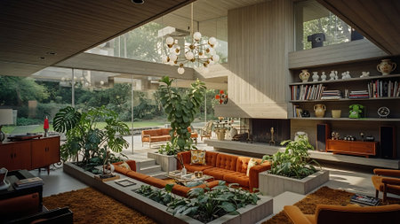 Sunlight streams through large windows, illuminating a cozy living room filled with plants and vintage furniture, creating a serene and inviting atmosphere.