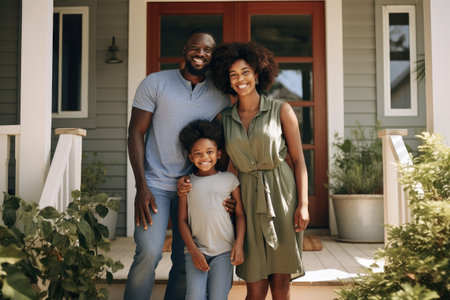 A man, woman, and child stand together in front of their house, Full length portrait of happy black family embracing while standing on porch of new house, AI Generated