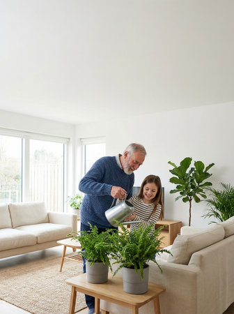 Grandfather And Granddaughter Watering Plants At Home On Sofa