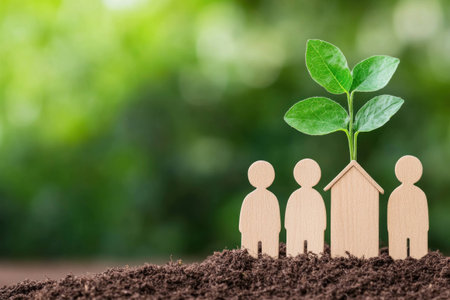 Wooden figures representing families with a small house and a growing plant, symbolizing eco friendly living and sustainable development in a lush green environment