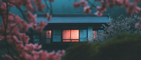 Cherry blossom trees surround a traditional Japanese house in serene dusk