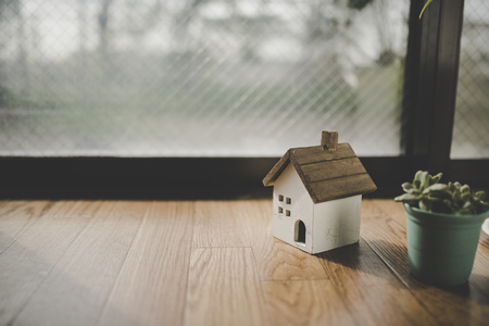 Miniature house model in the garden. Selective focus. Vintage tone.