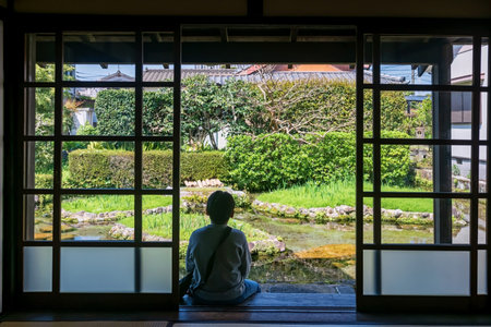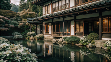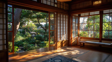 An interior space features traditional Japanese architecture, with wooden frames and sliding doors. Natural light streams in, illuminating a serene garden with rocks and plants. This visual concept suggests tranquility. Suitable for commercial applications, the image could be used for promoting culture, design or travel content.