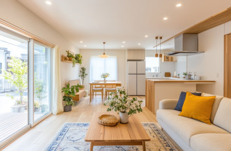 A photo of the interior space, with bright and clean white walls, a light wood floor, and furniture in natural colors such as yellow or blue. The open kitchen area has a dining table on one side and a refrigerator at the center island. A large window leads to an outdoor terrace. There is also a small wooden rug hanging above the sofa armrests. The living room has plants and flowers on the coffee tables. --ar 23:15 --v 6.1 Job ID: 672315b9-f19b-482a-94ee-7886462af906