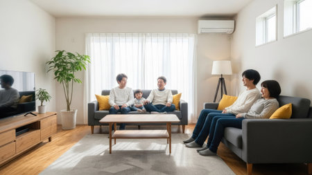 A family is gathered in a well-lit living room, seated on two grey sofas. The scene showcases a modern interior design with neutral tones, wooden furniture, and natural light. This image is suitable for various commercial uses, including lifestyle and home decor projects.
