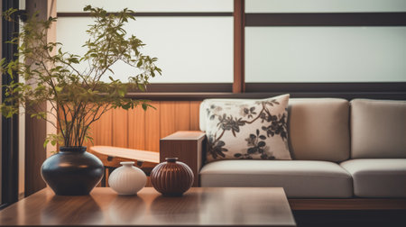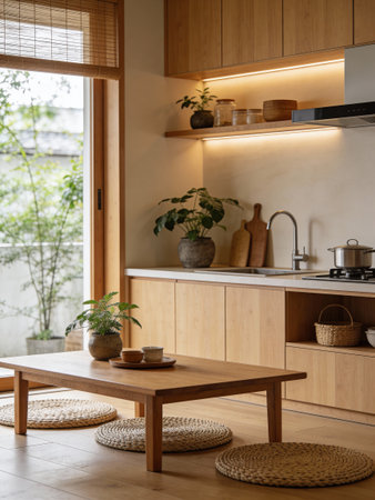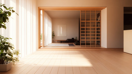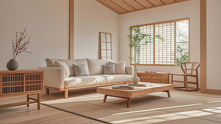 A high-resolution photo of the interior of a Japanese house, showcasing tatami mats, low wooden furniture, and a minimalist aesthetic with sliding doors and natural light.