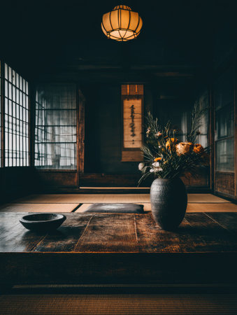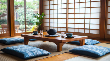 Traditional Japanese Interior with Tatami Mats, Tea Pot, and Serene Atmosphere.